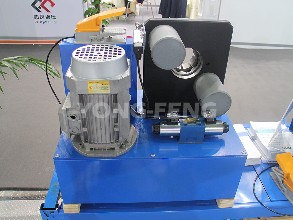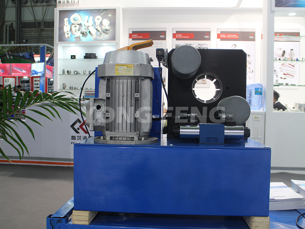 油泵安裝于油箱內浸泡在液壓油里達到科學散熱靜音的設計目的,油泵在電機驅動下,輸出液壓油,推動扣壓油缸內的柱塞運動,致使模座徑向收縮,實現模具對膠管接頭外套的擠壓。當收縮量達到千分尺預定值時,擠壓自動停止,電磁換向閥換向后,油缸內的柱塞反向運動,模具隨之張開,扣壓膠管完成。